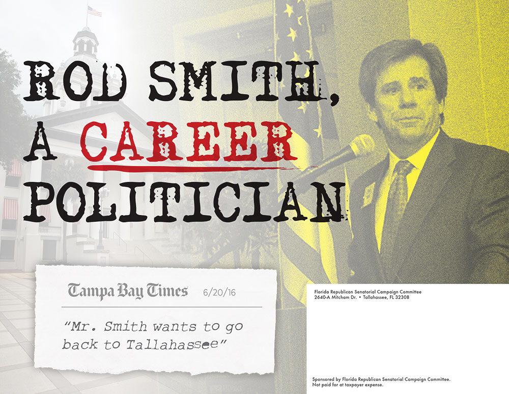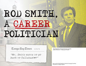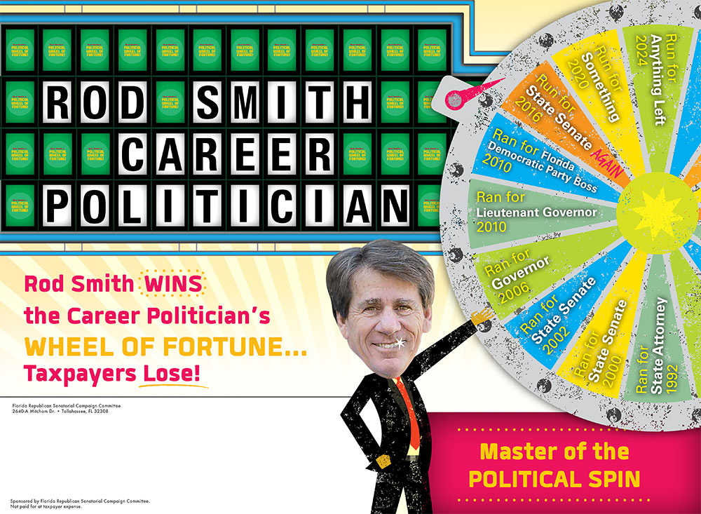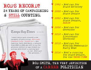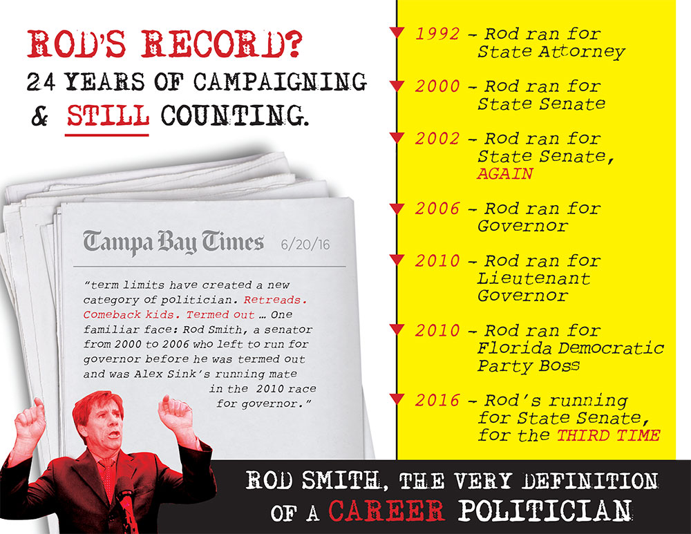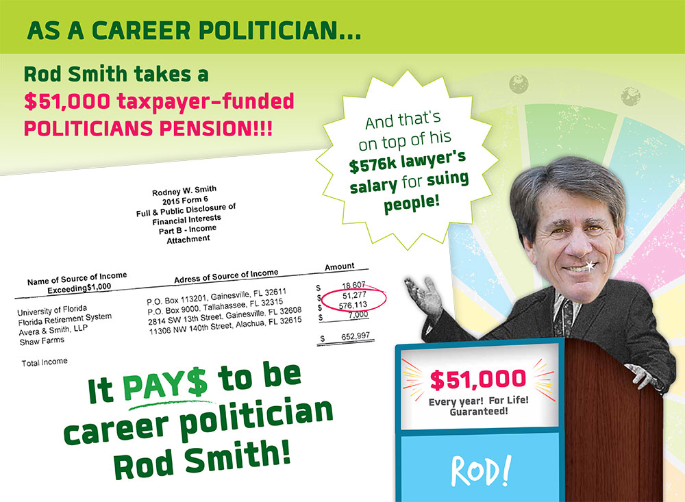 Career Politician Rod Smith voted to increase his own salary - several times. On top of his six-digit salary for filing lawsuits, he takes another $51,000 taxpayer-funded Politician's Pension.