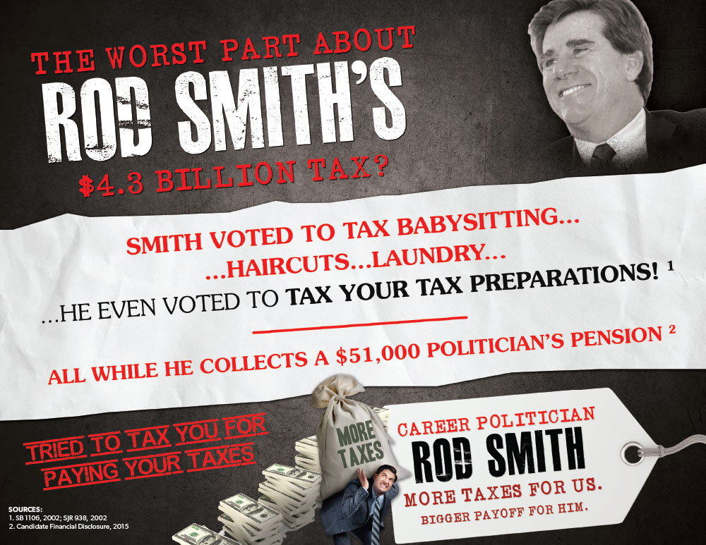 On top of Rod Smith's $51,000 Politician's Pension, he wants more. To get it, he'll even tax you for paying your taxes.